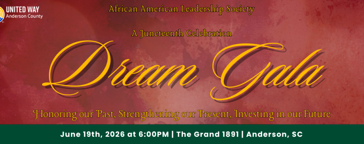 The African American Leadership Society is hosting the Dream Gala, the premiere Juneteenth celebration in Anderson County. Tickets on sale soon! Contact Jada Hudson (jada@uwandsc.org) for more information on tickets and sponsorships.
