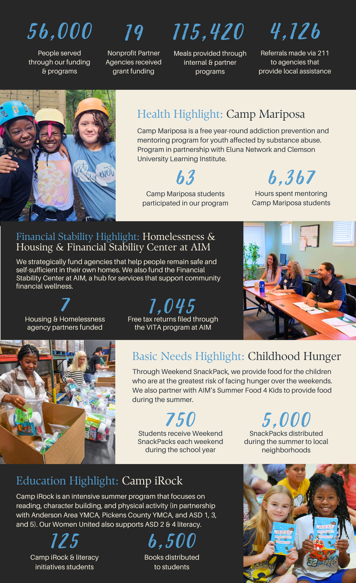At United Way of Anderson County, we’re dedicated to improving lives and strengthening our community through four focus areas: Healthy Community, Youth Opportunity, Financial Security, and Community Resiliency. We do this by strategically funding programs and creating partnerships to support a community so all may thrive. We go beyond temporary fixes and tackle some of the biggest, most complex problems facing our community. Last year, over 37,000 Anderson County residents were impact by our funding and programs!